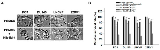 Cytolytic activity of Kib-IM-4-stimulated PBMCs co-cultured with prostate cancer cells. (A) Microscopy was used to visualize interactions between the PBMCs and cancer cells. Scale bar: 20 µm. (B) Cytotoxic activity was quantified by measuring the survival rates of prostate cancer cell lines (PC3, DU145, LNCaP, and 22RV1) co-cultured with Kib-IM-4-stimulated PBMCs at PBMC-to-cancer cell ratios (E:T) of 2:1 and 5:1. Survival rates were determined using a cell viability assay, with untreated cancer cells set as 100%. Data were analyzed using Student’s t-test and presented as mean ± SD from three independent experiments (* p < 0.05, *** p < 0.001).