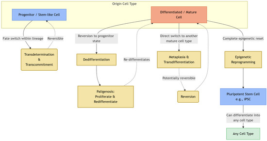 Cell plasticity refers to the ability of cells to modify their phenotypes in response to environmental signals without altering their genotypes [4,9]. Depending on the nature and direction of cell type transitions, cell plasticity can manifest in several forms: transdetermination, transdifferentiation, transcommitment dedifferentiation, reversion, paligenosis, and metaplasia. The majority of these processes involve cellular reprogramming, a mechanism by which cells alter their identity and function.