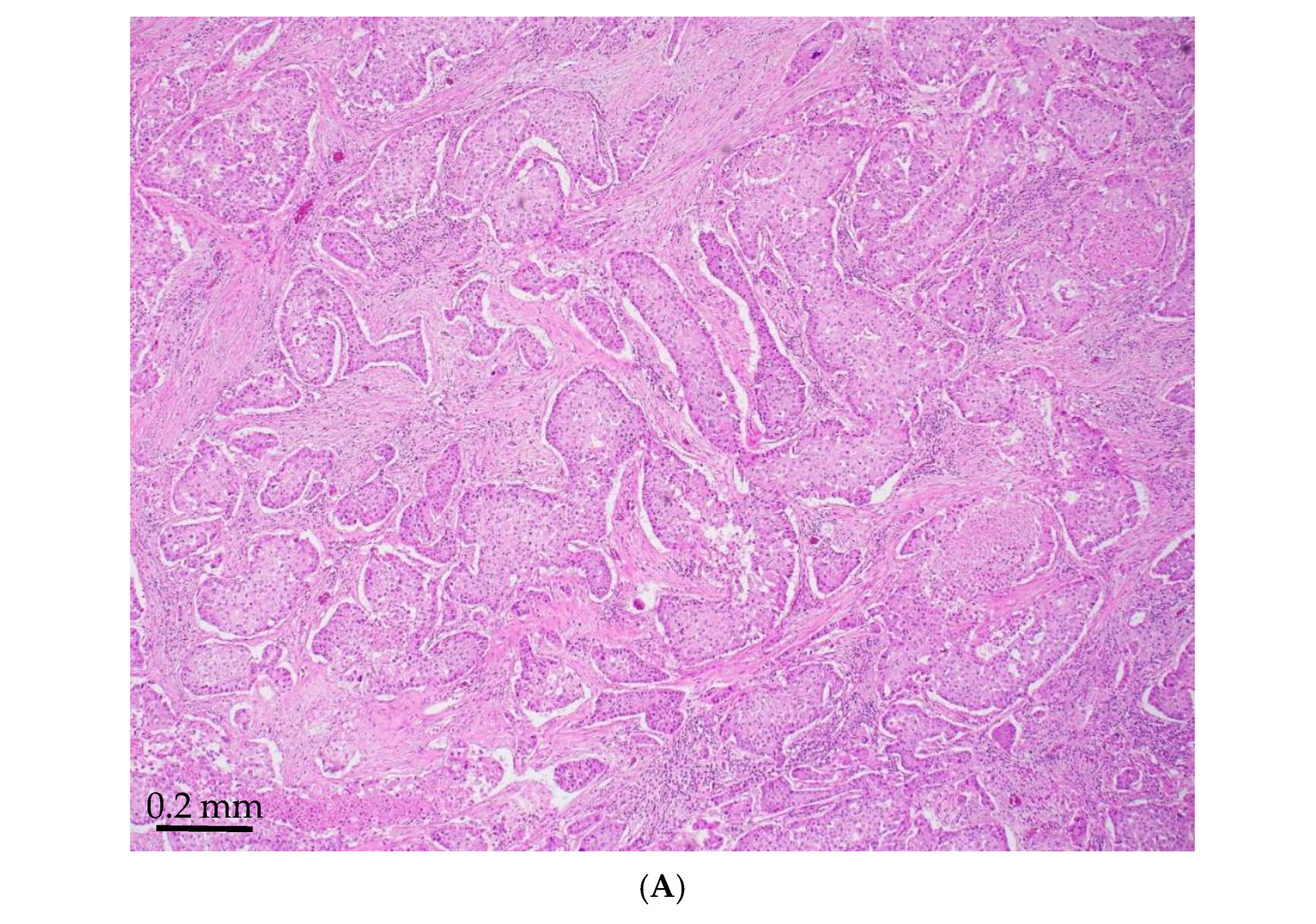 IHC stains were performed on some of the cases based on clinical needs at the time of original case sign-out. The IHC stains were performed with a Bond III automated immunostaining platform (Leica Biosystems, Nussloch, Germany) using standard clinical protocols with appropriate positive and negative controls. Briefly, unstained glass slides of 5 µm thick tissue sections were baked and dewaxed following standard procedures. Heat-induced epitope retrieval was performed using BOND Epitope Retrieval Solution 1 (ER1) or BOND Epitope Retrieval Solution 2 (ER2) (Leica Biosystems) at 100 °C for 30 min. The antibodies used included TTF-1 (SPT24, Leica, Wetzlar, Germany), Napsin-A (TMU-Ad02, Biocare, Pacheco, USA), p40 (BC28, Biocare), CK7 (RN7, Leica), and neuroendocrine markers (Synaptophysin (27G12, Leica), Chromogranin (5H7, Leica), CD56 (CD564, Leica), and INSM1 (A-8, Santa Cruz, USA), among others. The IHC stains were recorded as positive (at least 10% of tumor cells with moderate or strong stain) or negative for each case, as well as for the poorly differentiated and better differentiated components when both were present in the same tumor.