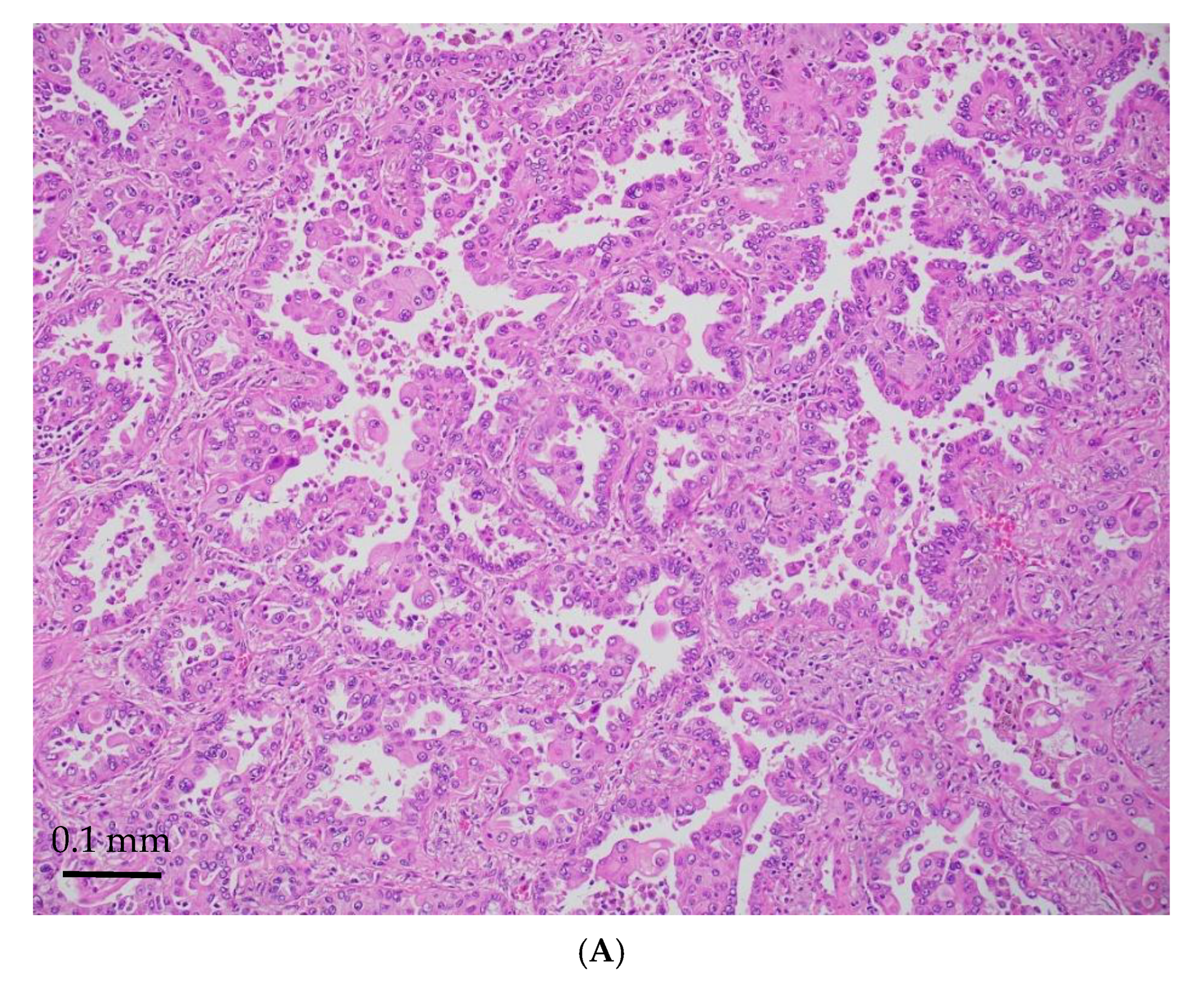 Adenocarcinoma is the most common malignancy in the lung. Lung adenocarcinoma (LADC) can be further subclassified into mucinous and non-mucinous subtypes. Smoking is the most common risk factor for lung cancers [1], including LADC. With the advancement of molecular techniques and cancer research, targetable gene alterations have become increasingly important in the treatment of cancers. For example, EGFR-targeted therapy has become a cornerstone in the management of advanced LADCs [2,3].