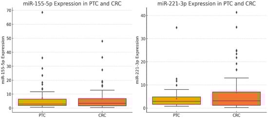 Box plots showing relative expression ratios (2−ΔΔCt) of miR-155-5p and miR-221-3p in colorectal cancer (CRC, n = 60) and papillary thyroid carcinoma (PTC, n = 50). The central line represents the median, boxes indicate the interquartile range (IQR), and whiskers show the minimum and maximum values. Mann–Whitney U tests were used to compare expression between CRC and PTC, and no significant differences were observed for either miRNA (miR-155-5p: p = 0.972; miR-221-3p: p = 0.944). This figure complements the categorical analysis by illustrating inter-sample variability in both tumor types.