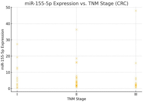 miR-155-5p expression across TNM stages in colorectal cancer (CRC, n = 60). Each point represents an individual tumor; horizontal bars indicate median expression per stage. A trend toward higher miR-155-5p levels was observed in more advanced stages; however, there was substantial overlap between stages, indicating marked inter-patient variability. Accordingly, this figure should be interpreted as showing an association rather than a stage-discriminating marker, particularly given the limited sample size.