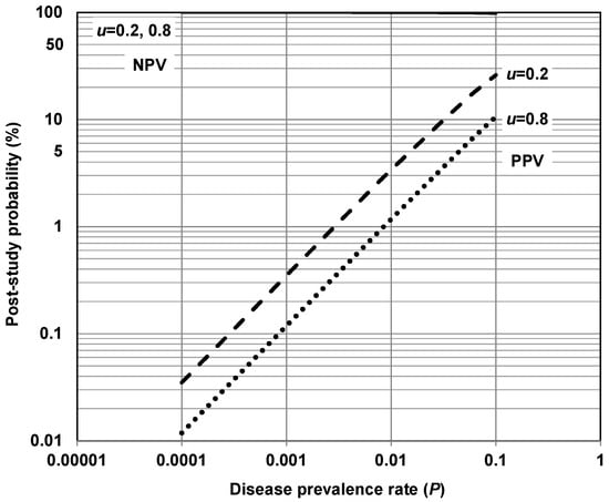 Theoretical probability of a research finding in a study being true as a function of disease prevalence rate for various levels of bias (u) (Note: For α = 0.05 and power = 80%; NPV = negative predictive value—probability that a negative (null) relationship (i.e., risk factor does not cause disease) is true; PPV = positive predictive value—probability that a positive relationship (i.e., risk factor causes disease) is true. Relationships for this figure are developed in SI 1).