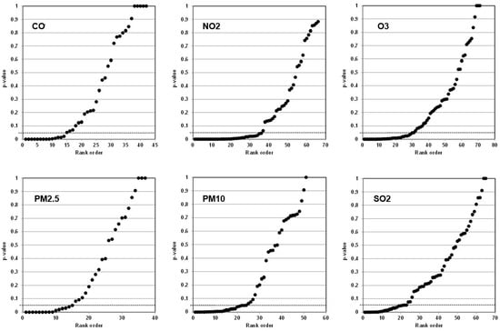 p-Value plots for each ambient air quality component were constructed and interpreted as follows []: