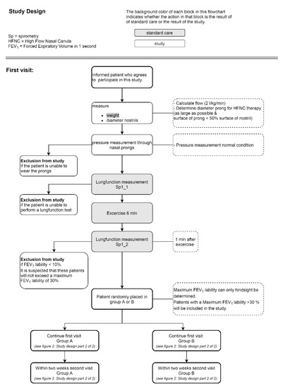 Children, aged 6–18 years, that previously performed a standard ECT with a FEV1 lability of ≥30% are included in this study. It is expected that HFNC therapy will speed up the recovery of an exercise-induced decline in lung function. We hypothesize that the recovery time to normal lung function will be halved using HFNC, which is considered to be clinically relevant. Pulmonary function recovers within 15–20 min in most 3–7 years old children and spontaneous recovery is most often nearly completed within 30 min [11,12]. Sample size analysis is performed with t-test of SPSS version 3.1.6. with a paired design [13]. The power is set to 80% and the significance level (α) 5%. It is estimated that the effect size is 50%, based on a mean recovery rate of 10 min when using HFNC therapy and 20 min for spontaneous recovery. The within group standard deviation is 12.5 min. Therefore, a minimum of 14 patients are necessary to obtain significant results.