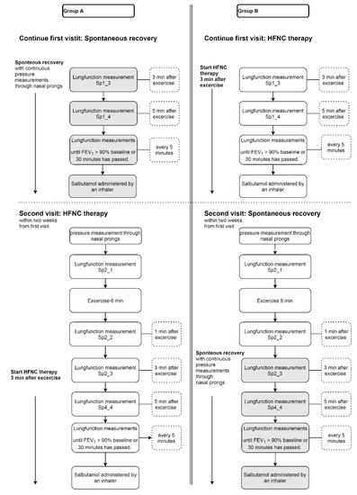 This study is a prospective crossover study, implying that each child has to perform the ECT twice during two separate hospital visits. One ECT with spontaneous recovery and one ECT with HFNC therapy. To minimize the burden on the children who are participating in this study, we use the hospital visit that is part of the standard care the obtain the spontaneous recovery measurements. During this visit, the fall of FEV1 and its reversibility during the ECT with spontaneous recovery is used to diagnose the severity of the asthma. In addition, a pressure measurement in the nasal airways is performed, using the prongs of the HFNC device. At set times, lung function tests are performed (see Figure 3). Lung function is measured using spirometry. For each lung function measurement spirometry is performed twice in a row. The ECTs are performed on different days within two weeks from each other at approximately the same time of the day. The order in which the tests are performed is randomly distributed over the different days. The study design is graphically represented in Figure 3 and Figure 4.