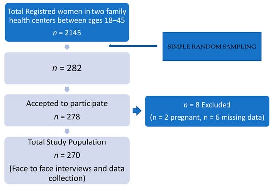 This research was conducted as an analytic and descriptive cross-sectional study. The research population consisted of women aged 18–45 who presented to the two university family health centers in Samsun, Turkey. The total population registered at these family health centers was 10,106. The number of women aged 18–45 in that registered population was 2145. The study sample size was determined as 222 with G-power 3.1.9.4 software at an effect size of 0.3, α = 0.05, and power (1-β) = 0.80 at a confidence level of 95%. We selected 282 women who had a previous pregnancy aged 18–45 from our patient lists of family health centers with a simple random sampling method. After the aim of the study was explained to them, the verbal and written consent of 278 participants who agreed to participate in the study was taken. Those who were pregnant during the study (n = 2) and those who gave incomplete or objective data were excluded from the study (n = 6). The study population consisted of 270 participants. The CONSORT follow chart about the design of the study is shown as Figure 1.