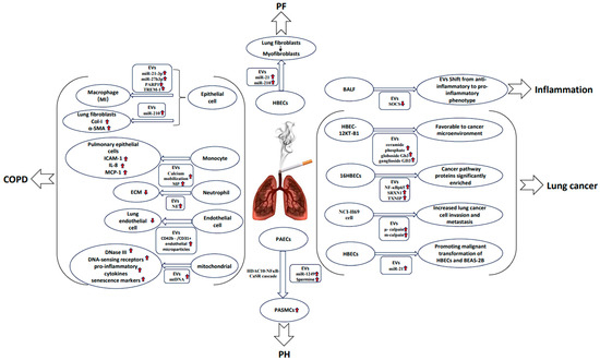 Induction and modulation of EVs by CS and their relevance in lung disease. CS induces the secretion of EVs, which carry proteins, nucleic acids, and lipids that may contribute to the development of diseases of the lung (COPD, lung cancer, pulmonary fibrosis, and pulmonary hypertension). Red arrows indicate an increase/decrease in substance or an enhancement/weakening of a reaction.