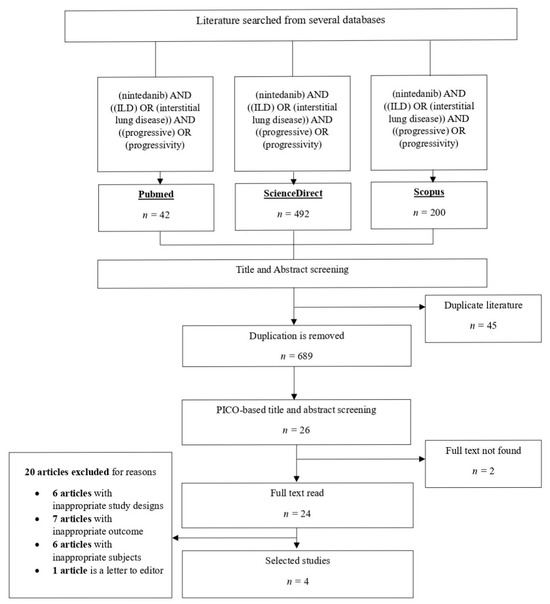A mini-review was conducted using various databases. Searches were performed in PubMed, ScienceDirect and Scopus using the terms (nintedanib) AND ((ILD) OR (interstitial lung disease)) AND ((progressive) OR (progressivity)), as shown in Table 1. The number of search results obtained for each database can be seen in Table 2. Studies that were duplicates were deleted, and studies were selected based on eligibility criteria, title and abstract screening according to PICO and full-text selection. All selected studies were subjected to a critical appraisal using appraisal tools from the Oxford Center for Evidence-Based Medicine (OCEBM) for intervention studies.