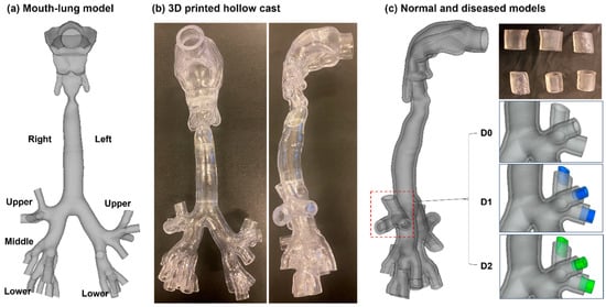 Normal and diseased respiratory models: (a) mouth–lung geometry extending to G5, (b) 3D-printed casts, and (c) normal (D0) and diseased (D1, D2) lung models with mild (blue) and severe (green) constrictions.