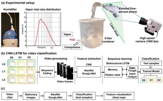 A Phantom 13100L high-speed camera (Ametek, Wayne, NJ, USA), capable of capturing up to 11,000 frames per second, recorded the exhaled flow with aerosol mists at 1500 fps (Figure 2a). A 100 mW, 488 nm laser sheet was used to ensure adequate illumination of the mist droplets for clear visualization. Exhaled mist patterns were systemically recorded from both the normal (D0) and two asthmatics (D1 and D2) at three flow rates (20, 15, and 10 L/min), corresponding to a mean velocity of 1.0, 0.75, and 0.5 m/s through a mouth outlet of 20.8 mm. The video recordings at 20 L/min were used to train the CNN-LSTM classifier, while those at 15 L/min and 10 L/min were used as deviants to test the robustness of the trained CNN-LSTM classifier. For each test condition (i.e., with a given lung model and flow rate), a recording of one minute or longer was taken, which was further segmented into 30 clips or so, with each clip lasting 2 s. Each test was repeated three times or more, generating at least 90 video clips for each test case. The network’s classification robustness to temporal features was also tested by shifting the video clips by 1 s.