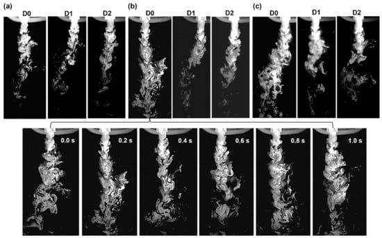 The effects of flow rate on exhaled flows can be evaluated by comparing Figure 3a–c (i.e., 20 L/min, 15 L/min, and 10 L/min). At the highest flow rate (Figure 3a), there is a strong, fast jet of exhaled air. In healthy lungs, this jet is coherent and penetrates longer, whereas, in diseased states, particularly in D2, it is disrupted to the extent that it becomes less visible due to turbulent mixing. At lower flow rates (Figure 3b,c), the exhaled air has less kinetic energy, leading to a more stable vortex flow in D0, which evolves at a slower pace and remains visible for a longer time and distance. By contrast, the disruption to vortex flows due to disease (D1 and D2) remains noticeable at 15 and 10 L/min, with both cases maintaining perceivable diffusion and disorganization (Figure 3b,c).