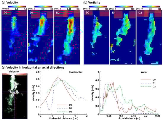 The videos were analyzed using PIVlab to explore the flow characteristics. Figure 4 shows the PIVlab-derived velocities and vorticities of the videos from D0, D1, and D2 at 20 L/min.
