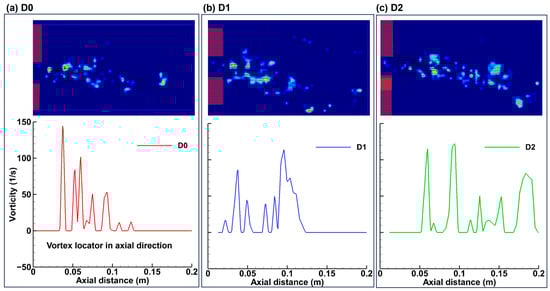 The instantaneous vorticity maps corresponding to the above velocity contours are presented in Figure 4b. It is clearly shown that the flow regions with the highest vorticity intensity are not the same as the regions with high velocities. High-vorticity regions are observed at both the flow cores and boundaries, where a large velocity gradient exists.
