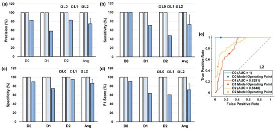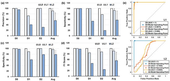 Comparison of the AlexNet-LSTM performance metrics of 3-class classification (D0, D1, D2) on video test sets with increasing levels of flow deviations (L0, L1, L2): (a) precision, (b) sensitivity, (c) specificity, (d) F1 score, and (e) ROC profiles on L2 video test sets.
