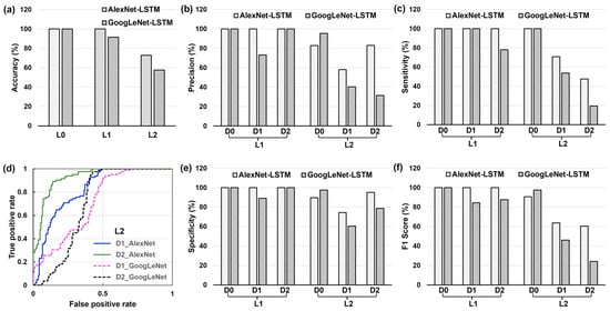Comparison of classification performance between AlexNet-LSTM and GoogLeNet-LSTM on video test sets with increasing levels of flow deviations (L0, L1, L2): (a) accuracy, (b) precision, (c) specificity, (d) ROC profiles on L2 video test sets, (e) sensitivity, and (f) F1 score.