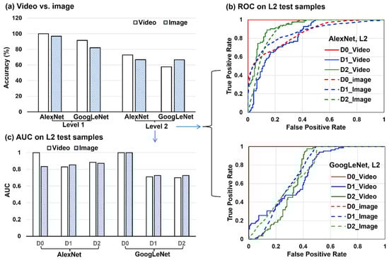 The areas under the curve (AUCs) of the ROC curves in Figure 9b are shown in Figure 10b. Considering AlexNet, a much higher AUC value is noted for D0 with video inputs compared with still images, while insignificant differences between videos and images are noted for D1 and D2, which lead to a cumulatively better performance with videos than images. On the other hand, when tested at Level 2 difficulty, GoogLeNet gives an equivalent AUC on D0 images but lower AUC values on D1 and D2 imaging, leading to an overall inferior classification for videos than still images, consistent with a lower video accuracy in Figure 9a and intermingling video/image ROC curves in Figure 6b.