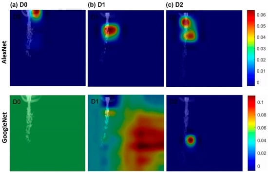 To evaluate the robustness of the video-classification models, both AlexNet-LSTM and GoogLeNet-LSTM were trained on video clips acquired at 20 L/min but tested on videos acquired at three flow rates, 20 L/min, 15 L/min, and 10 L/min, representing a difficulty level of Level 0 (baseline), Level 1, and Level 2, respectively. A ten-fold cross-validation approach was used to train the model, with the dataset randomly divided into ten equal-sized subsets. Ten runs were conducted and, in turn, nine subsets were used for training and the reaming dataset was used for testing [51]. To compare the diagnostic ability between AlexNet-LSTM and GoogLeNet-LSTM, both accuracy and categorical matrices, such as precision, sensitivity, specificity, F1-Score, ROC curve, and AUC, were calculated for each model, particularly at the Level 2 difficulty. To evaluate the LSTM’s sequence learning effect on model performances, the video clips were split into still images, which were further used to train and test AlexNet and GoogLeNet. Heat maps designating the most important regions for model classification were found in terms of occlusion sensitivity for D0, D1, and D2 in both AlexNet and GoogLeNet.