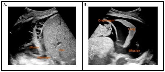 Ultrasonography is the preferred modality to evaluate pleural effusion given that it is readily accessible and highly specific in estimating the volume of any pleural effusion [5,34]. Complex septated and complex homogenous effusions are highly predictive of exudative effusions, with a specificity of 94% and a positive predictive value of 94% [35]. Although transudative effusions are typically anechoic in nature, exudative effusions can also appear anechoic [36]. Homogenously echogenic effusions on ultrasound are highly suggestive of underlying hemorrhage or empyema [37]. Other characteristic findings include echogenic swirling, septations, and loculations [38] (Figure 2). Additionally, ultrasonography is also useful in guiding both diagnostic and therapeutic aspirations [39].