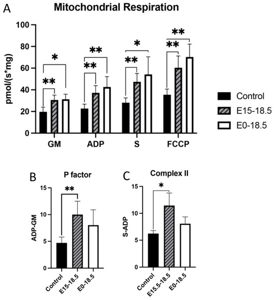 Altered mitochondrial activity in response to increased expression of RAGE in lung tissue. RAGE upregulation alters mitochondrial bioenergetics in developing lungs. Upregulation of RAGE was induced in RAGE TG pup lung tissue from E15-18.5 and E0-18.5 and compared to dox-fed nontransgenic controls (n = 8 mice per group). Mice were sacrificed on day E18.5 and mitochondrial respiration (A), respiratory P factor (B), and Complex II activity (C) were evaluated. Permeabilized lung tissue samples were sequentially treated with glutamate (10 mM) and malate (GM; 2 mM); +ADP (2.5 mM); +succinate (S; 10 mM); + FCCP (2 mM). Mann–Whitney tests were used, resulting in differences noted as * p ≤ 0.05 or ** p ≤ 0.01.
