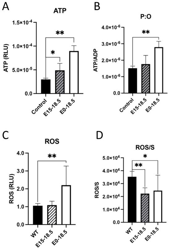 Altered levels of ATP or reactive oxygen species (ROS) in response to upregulated expression of RAGE in lung tissue. Following RAGE upregulation from E15-18.5 or E0-18.5, ATP levels were measured in RAGE TG and nontransgenic controls. Levels of ATP were significantly increased in both groups of RAGE TG mice (A). When normalized to ATP synthase activity (ADP), ATP was only significantly increased in E0-18.5 treatment mice compared to controls (B). The DCFDA assay was used to quantify changes in ROS in RAGE TG mice with RAGE upregulation from E15-18.5 or E0-18.5 and compared to nontransgenic controls. ROS was significantly increased in tissue treated from E0-18.5 compared to controls (C). When normalized to complex 2 activity (S), there was a significant decrease in production of ROS in both RAGE TG groups compared to controls (D). Mann–Whitney tests were used, resulting in differences noted as * p ≤ 0.05 or ** p ≤ 0.01.