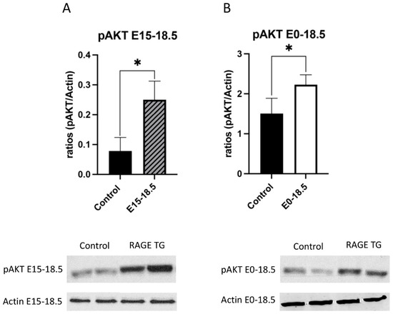 Increased pAKT in response to RAGE upregulation in lung tissue. Levels of phosphorylated AKT (pAKT) were screened in lungs from both groups of RAGE TG mice and compared to nontransgenic controls. Active pAKT was significantly increased in RAGE TG lungs treated from E15-18.5 (A) or E0-18.5 (B) compared to controls (n = 4 per group). Representative blots for pAKT and actin are shown and Mann–Whitney tests revealed differences noted as * p ≤ 0.05.