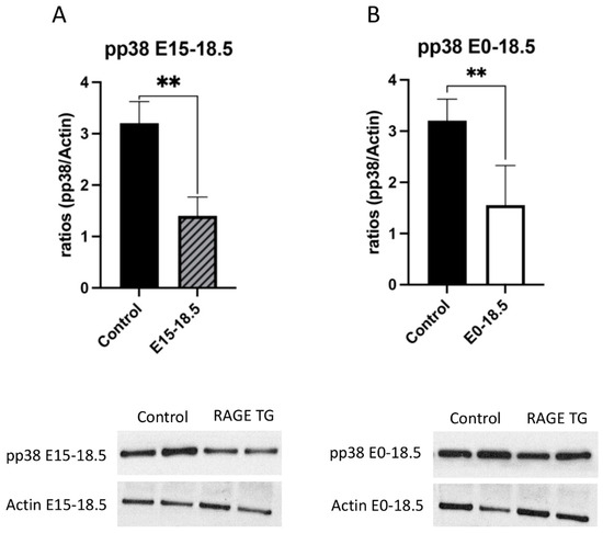 Decreased pp38 in response to RAGE upregulation in lung tissue. Levels of phosphorylated p38 (pp38) were screened in lungs from both groups of RAGE TG mice and compared to nontransgenic controls. Active pp38 was significantly decreased in RAGE TG lungs treated from E15-18.5 (A) or E0-18.5 (B) compared to controls (n = 4 per group). Representative blots for pp38 and actin are shown and Mann–Whitney tests revealed differences noted as ** p ≤ 0.01.