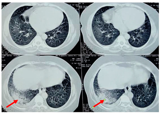 A chest radiograph showed patchy consolidation in the right lower lobe and mild pleural effusion. To obtain a better view of the lesion, a high-resolution computed tomography scan was performed, which showed patchy foci of air space consolidation in the right lower lobe along with pleural effusion (Figure 1).