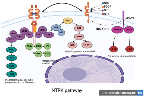 The neurotrophic tropomyosin receptor kinases TRKA, TRKB and TRKC are a family of transmembrane tyrosine kinases that are essential players in neural development [3,4]. Encoded by NTRK1, NTRK2, and NTRK3 genes, these receptors can undergo oncogenic rearrangements with several partner genes, leading to somatic fusions in several types of tumors including lung cancer [5,6,7,8]. Fusion events lead to receptor activation or overexpression, driving oncogenesis [1,9]. Neurotrophin binding to the TRK receptor’s extracellular region typically triggers receptor dimerization, transphosphorylation, and downstream signaling [10,11] (Figure 1). Additionally, neurotrophins can bind to the p75NTR receptor, which modestly interacts with NGF [12,13].
