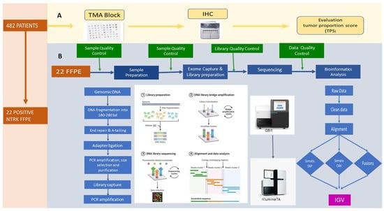 The pipeline started with the construction of tissue microarrays (TMAs). After pathological evaluation, cases with positivity for TRK by immunohistochemistry were selected, and whole-exome sequencing (WES-NGS) was undergone once quality control was carried out.