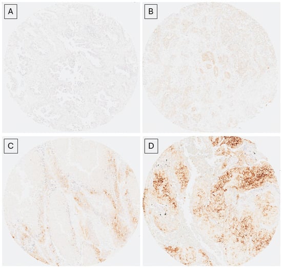 Immunohistochemistry NTRK staining (EPR17341 clone Abcam). Composition performed with Hamamatsu scanner. (A) corresponds to an AdCa score of 0 (4×); (B) is an AdCa with a score of +1 (4×); (C) is an SqCC with a score of +2 (4×) and (D) is an SqCC with a score of +3 (4×).