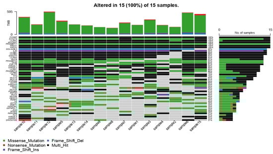 The Oncoplot provides an overview of somatic mutations in particular genes (rows) affecting 15 individual patient samples (columns). Color coding indicates the type of mutation. The top bar represents the number of mutations a patient carried; the side bar represents the number of patients who carried a certain mutation; and the bottom bars represents the SNP transitions and transversions. The bars’ colors show the overall distribution of six different conversions in each sample.