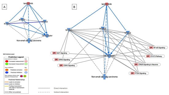 IPA. The relationship of Larotrectinib and NTRK1,2,3 with non-small-cell lung cancer using the “Path Explorer” tool in IPA. (A) An elevated level of Larotrectinib was simulated using the “MAP” tool in IPA, showing a direct inhibition of NSCLC through a direct interaction with the Trk receptor. (B) High levels of Larotrectinib block the NTRK1,2,3 genes and inhibit NSCLC. The relationship between the pathways involved are shown as well. CP: Canonical Pathway.
