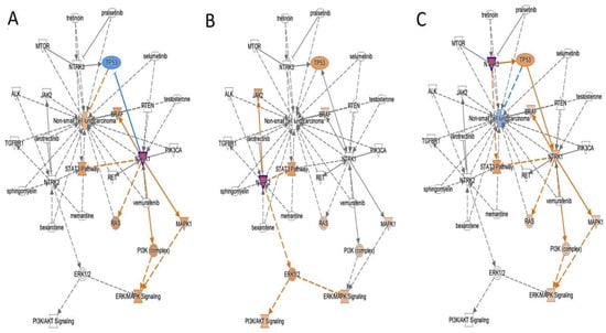IPA’s model prediction in NSCLC. Blue color represents inhibition in the pathways, and orange color represents activation. Pink triangle depicts NTRK1, NTRK2 and NTRK3 repectively in (A–C). Gray lines depict other present signals without activation. (A) Activation of NTRK1 related to lung cancer generation; (B) NTRK2 activation expresses indifferent behavior; (C) a reverse response with the activation of NTRK3 that causes inhibition of the development of lung cancer.