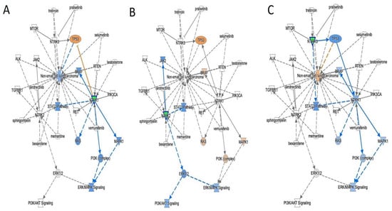 IPA’s model prediction in NSCLC. Blue color represents inhibition in the pathways, and orange color represents activation. Pink triangle depicts NTRK1, NTRK2 and NTRK3 repectively in (A–C). Gray lines depict other present signals without inhibition. (A) Inhibition of NTRK1 related with lung cancer inhibition; (B) NTRK2 blocking expresses indifferent behavior; (C) a reverse response where the inhibition of NTRK3 causes the development of lung cancer.