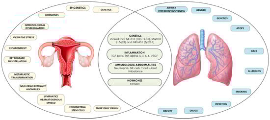 Figure 1. Endometriosis and asthma—one a gynecological disorder [40] and the other a respiratory condition (https://ginasthma.org accessed on 1 October 2024)—share several underlying biological mechanisms that suggest common ground in their pathophysiology.