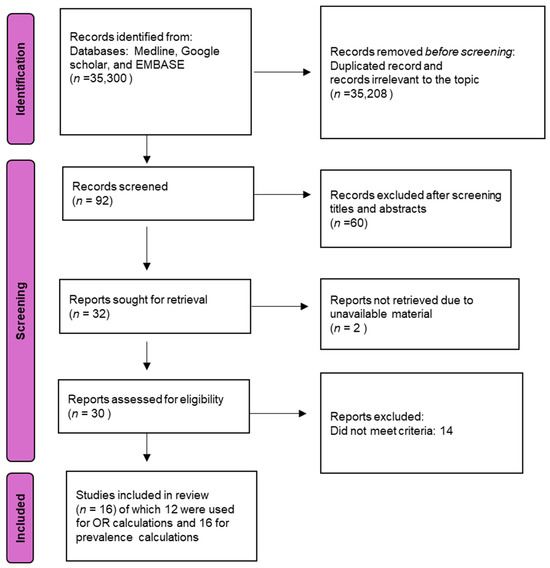 As depicted in Figure 2, 92 titles and abstracts were screened for relevance, and 32 were selected for full-text review. After further evaluation, 16 studies met the inclusion criteria for the systematic review, of which 12 were included in the odd ratios (OR) calculations and 16 in the prevalence calculations.