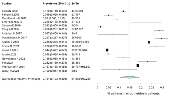 Figure 3. The pooled prevalence of asthma in patients with endometriosis. Square boxes represent the estimates from individual studies, horizontal lines indicate their 95% confidence intervals (CIs), and the diamond-shaped figure represents the 95% CI for the overall pooled estimates. Sinaii N (2002) [37], Ferrero S (2005) [39], Metalliotakis H (2012) [50], Smorgick N (2013) [38], Caserta D (2016) [42], Peng Yi-Hao (2017) [35], Al-Jefout M (2017) [43], Matalliotakis M (2017) [52], Alqaisi S (2018) [44], Shafir A.L. (2021) [45], Yoshii E (2021) [46], Joud A (2022) [47], Nowakoska A (2022) [51], Pan (2024) [48], Imbroane M.R. (2024) [49], Cialuj T.A. (2024) [19].