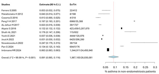Figure 4. The pooled prevalence of asthma in patients without endometriosis. The square boxes represent individual study estimates, the horizontal lines indicate the 95% confidence intervals (CIs), and the diamond-shaped figure represents the 95% CI for the overall pooled estimates. Ferrero S (2005) [39], Matalliotakis H (2012) [50], Caserta D (2016) [42], Peng Y-H (2017) [35], Al-Jefout M (2017) [43], Alqaisi S (2018) [44], Shafir A.L. (2021) [45], Yoshii E (2021) [46], Joud A (2022) [47], Nowakowska A (2022) [51], Pan G (2024) [48], Imbroane M.R. (2024) [49].