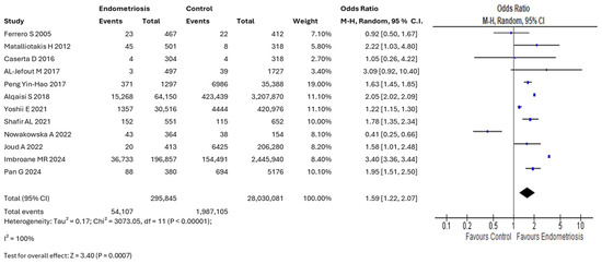 Figure 5. Pooled odds ratios of asthma in endometriosis patients. Square boxes represent individual studies, horizontal lines represent 95% confidence intervals (CIs), and diamond-shaped figures 95% CIs of pooled estimates. Ferrero S (2005) [39], Matalliotakis H (2012) [50], Caserta D (2016) [42], Al-Jefout M (2017) [43], Peng Y-H (2017) [35], Alqaisi S (2018) [44], Yoshii E (2021) [46], Shafir A.L. (2021) [45], Nowakowska A (2022) [51], Joud A (2022) [47], Imbroane M.R. (2024) [49], Pan G (2024) [48].