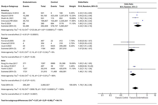 Figure 7. Pooled odds ratios of asthma in endometriosis patients, categorized by region. Square boxes represent estimates from individual studies, horizontal lines indicate their 95% confidence intervals (CIs), and the diamond-shaped figure represents the 95% CI for the overall pooled estimate. Matalliotakis H (2012) [50], Alqaisi S (2018) [44], Shafir AL (2021) [45], Imbroane MR (2024) [49], Pan G (2024) [48], Ferrero S (2005) [39], Caserta D (2016) [42], Joud A (2022) [47], Peng Y-H (2017) [35], Al-Jefout M (2017) [43], and Yoshii E (2021) [46].