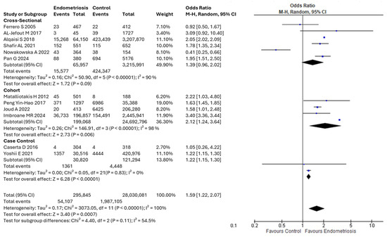 Figure 8. Pooled odds ratios of asthma in endometriosis patients by study type. Square boxes represent individual studies; horizontal lines represent 95% confidence intervals (CIs); and diamond-shaped figures 95% CIs of pooled estimates. Ferrero, S. [39], AL-Jefout, M. [43], Alqaisi, S. [44], Shafir, A.L. [45], Nowakowska, A. [51], Pan, G. [48], Matalliotakis, H. [50], Peng, Yin-Hao [35], Joud, A. [47], Imbroane, M.R. [49], Caserta, D. [42], Yoshii, E. [46].