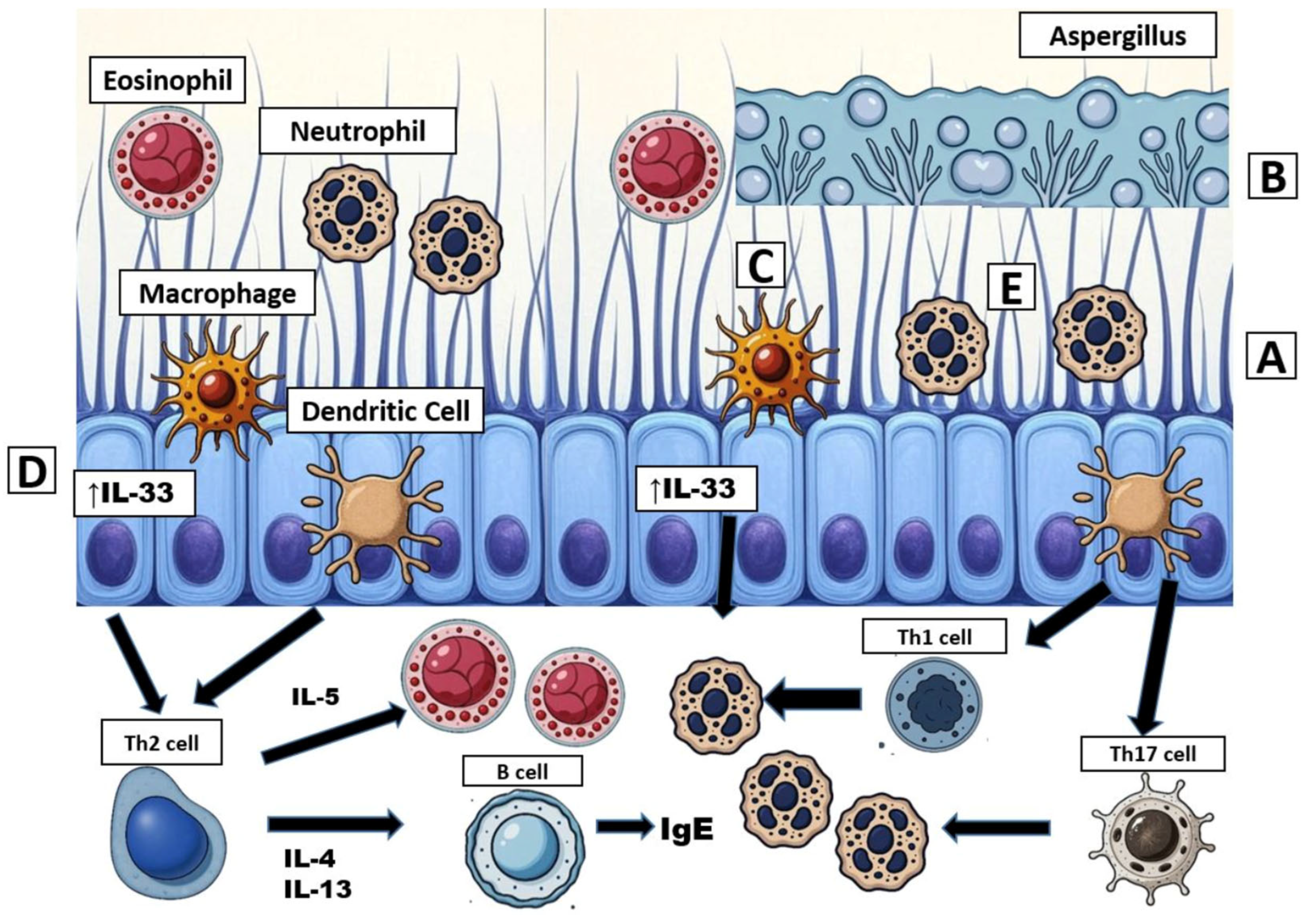 Although other immune cells, such as eosinophils and mast cells, are not central to the development of CF lung disease, they play a more prominent role in the pathogenesis of ABPA. At baseline, PwCF without ABPA may have increased activation of eosinophils [53]. After exposure to A. fumigatus, eosinophils are actively recruited to the airways via multiple cytokines, including IL-5, as part of the Th-2 hypersensitivity reaction and participate in the allergic inflammatory response [54]. Eosinophilia, although not included in the diagnostic criteria, is a common laboratory finding associated with ABPA. Once recruited, they are cross-linked by different antibodies including A. fumigatus specific IgE, which leads to degranulation and inflammation [55]. Similarly, mast cells become cross-linked by IgE antibodies and release inflammatory mediators such as histamine, leukotrienes, platelet-activating factors, and prostaglandins (e.g., PgD2) that induce vascular permeability [56,57]. The IgE levels that activate these effector cells are significantly elevated in ABPA from IL-4 assisted B and T cell interaction as well as B cell IgE isotype switching [58]. The B cells in patients with ABPA have also been found to be more sensitive to IL-4 stimulation, emphasizing the close interplay between these mediators and effector cells to augment the Th-2 hypersensitivity response to the fungal pathogen [59].