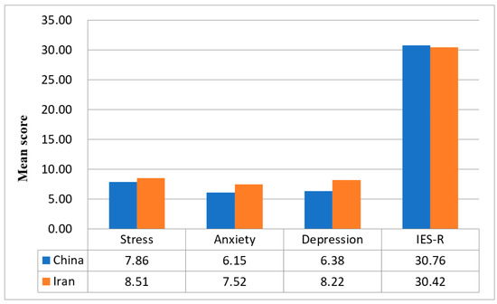 For the DASS-stress subscale (MChina = 7.86, SDChina = 7.93; MIran = 8.51, SDIran = 10.61), the difference between two countries was insignificant (t = −1.24, p > 0.05, 95%CI −1.69 to 0.38) (see Figure 1). For the DASS-anxiety subscale (MChina = 6.15, SDChina = 6.94; MIran = 7.52, SDIran = 8.90), Chinese had significantly lower anxiety scores (t = −3.07, p < 0.01, 95%CI −2.25 to −0.49. For the DASS-depression subscale (MChina = 6.38, SDChina = 7.39; MIran = 8.22, SDIran = 10.90), Chinese had significantly lower depression scores (t = −3.48, p < 0.01, 95%CI −2.88 to −0.80). For IES-R (MChina = 30.76, SDChina = 16.34; MIran = 30.42, SDIran = 15.82), there was no significant difference between two countries (t = 0.39, p > 0.05, 95%CI −1.38 to 2.06). As the mean IES-R scores for Chinese and Iranian respondents were higher than 24 points, indicating the presence of PTSD symptoms in both samples.