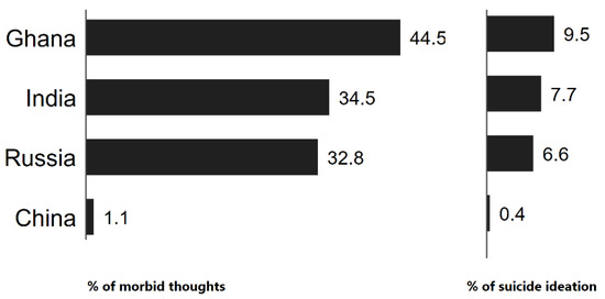 Figure 1 shows that the percentage of having morbid thoughts and suicidal ideation was highest in Ghana and lowest in China.