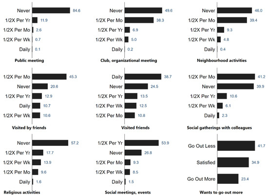 As illustrated by Figure 2, a great majority of the participants reported not participating in activities such as public meeting (84.6%, n = 1707), club meeting (49.6%, n = 1001), neighborhood activities (46%, n = 928), religious activities (57.2%, n = 1154). Visiting friends was the most reported daily activity (38.7%, n = 781) followed by being visited by friends (10.6%, n = 214) and taking part in social gatherings with colleagues (2.3%, n = 46). Almost a quarter of the participants reported that they would like to go out more (23.4%, n = 472) while 34.9% (n = 704) were satisfied with their current level of outing.