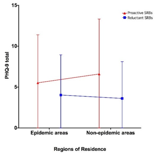Regarding mental health status, a 2 × 2 ANOVA showed significant interactions on total scores of PHQ-9 (F (1,1049) = 4.061, p = 0.044). In non-epidemic areas, people with proactive SRB had more depressive tendencies than people reluctant towards SRB, whereas people did not differ in epidemic areas. Comparing each condition, those living in non-epidemic areas and engaging in active SRB have the highest depressive tendency (Figure 1).