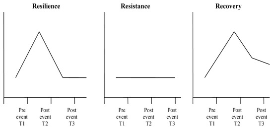 Figure 1 highlights that resilience represents a reasonably rapid return to homeostasis once displaced (pre-event T1 to post-event T3), suggesting ‘bounce-back-ability’ and a stable trajectory of healthy functioning [47,48]. This transient perturbation, shown as a ‘witches hat’, may last between weeks and months [49]. Resilience is contrasted from the other trajectories by a temporally different response to adversity. Resistance minimises dysfunction because coping resources are present at the time of displacement (T2); therefore, post-event realignment at T3 is unlikely. Recovery involves a prolonged period of dysfunction (a threshold psychopathology, e.g., depression) lasting several months or more (T2), followed by a gradual return to pre-event functioning. Although stress responses are highly individualised, this set of trajectories helps to explain the patterns of behaviours following exposure to trauma.