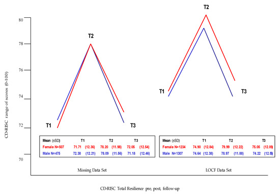 Pre, post, and follow-up mean scores for total resilience (TR) and subscales by gender (Missing Data and last observation carried forward (LOCF) datasets).