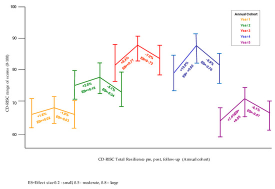 One-way ANOVAs revealed significant differences in TR diff and all subscales between T2 to T3 and T1 to T3 by annual cohort for both data sets. Figure 3 illustrates TR trajectories for each annual cohort across all time points for the LOCF data set. This shows that the last three annual cohorts reported small improvements in TR at T3, compared to pre-programme levels. MANOVA highlighted that there was no interaction effect involving gender and annual cohort for TR diff and subscales between T2 and T3 for both data sets. This suggested consistency in the decrease of resilience for males and females across cohorts at follow-up. However, a similar analysis of variables between T1 and T3 indicated that females achieved more sustained resilience than males across both data sets.